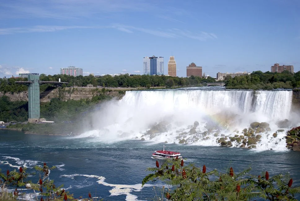 A view of a rainbow in the mists of the American Falls with the Hornblower catamaran sailing past